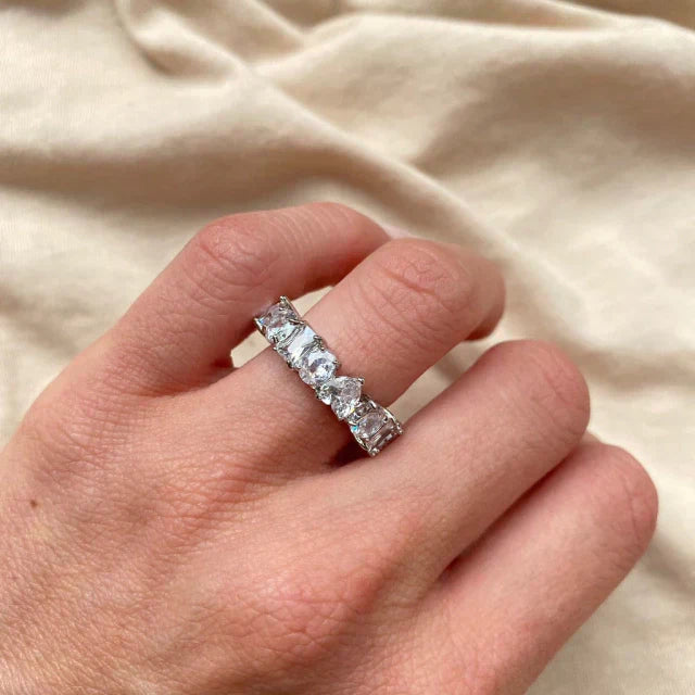 Anel shanti cravejado com zircônia em forma de coração, redonda e quadrada, com banho de ródio.
