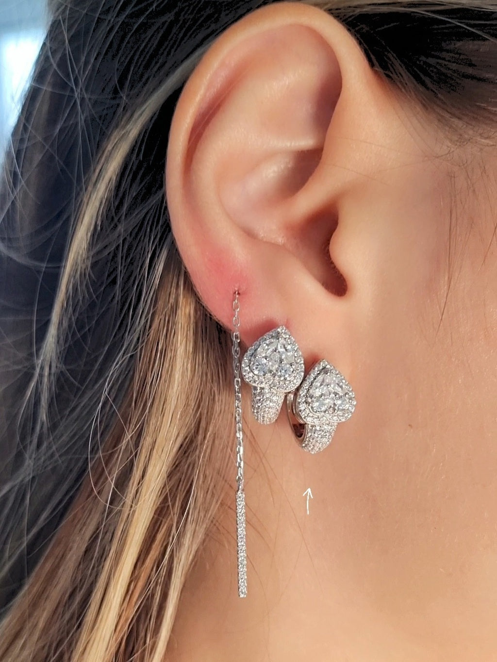 Brinco confeccionado em Prata 925, design superior em formato coração, cravejado com zircônias brancas.