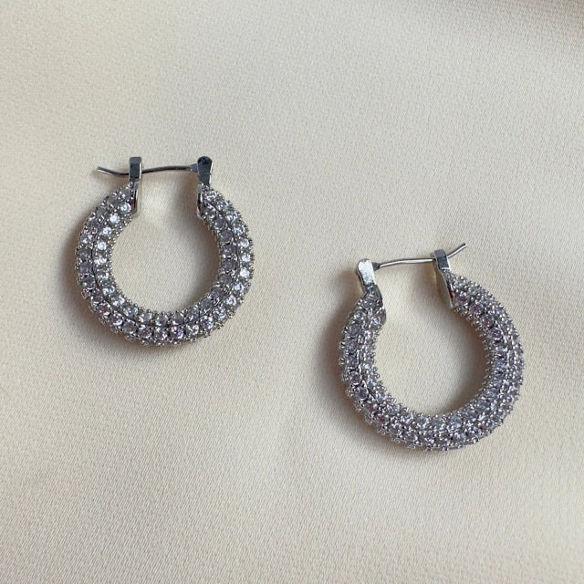 Brinco de argola cravejado com zircônia e com banho de ródio.