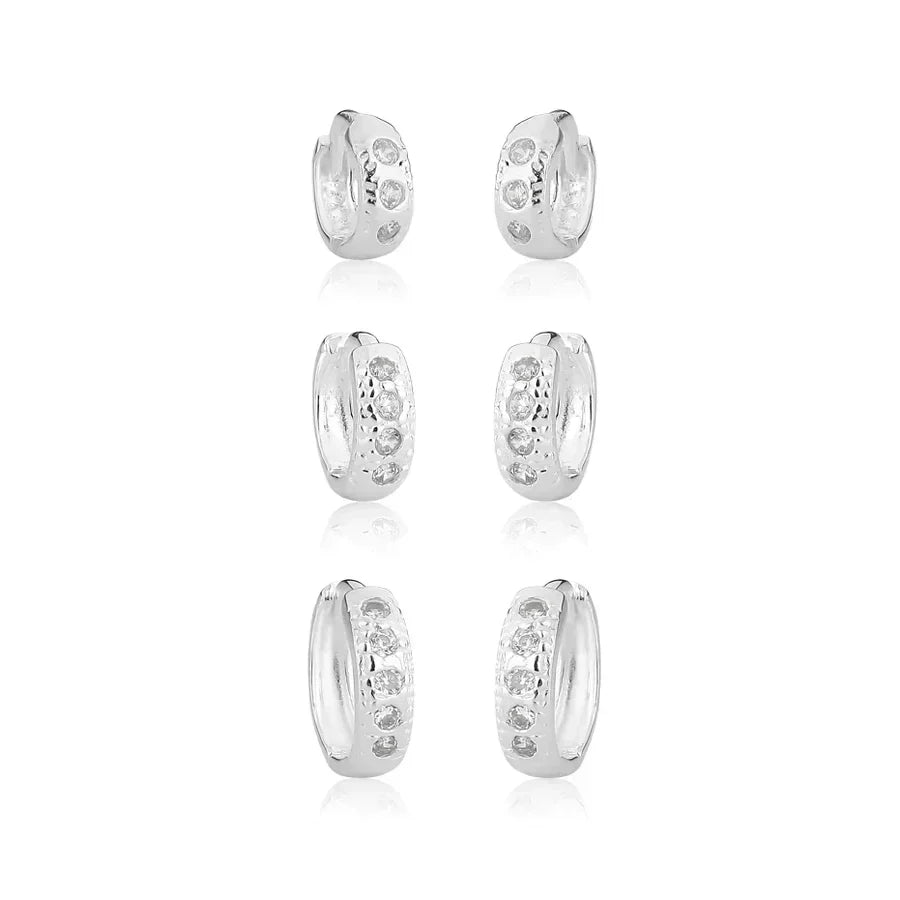 Trio de Brinco Argola Cravejado 1 Fileira de Prata 925, vem com 3 peças lindas com acabamento perfeito com pedras de cor cristal de 1,5mm e fecho de encaixe, além de ser feito com um material de excelente qualidade e durabilidade.