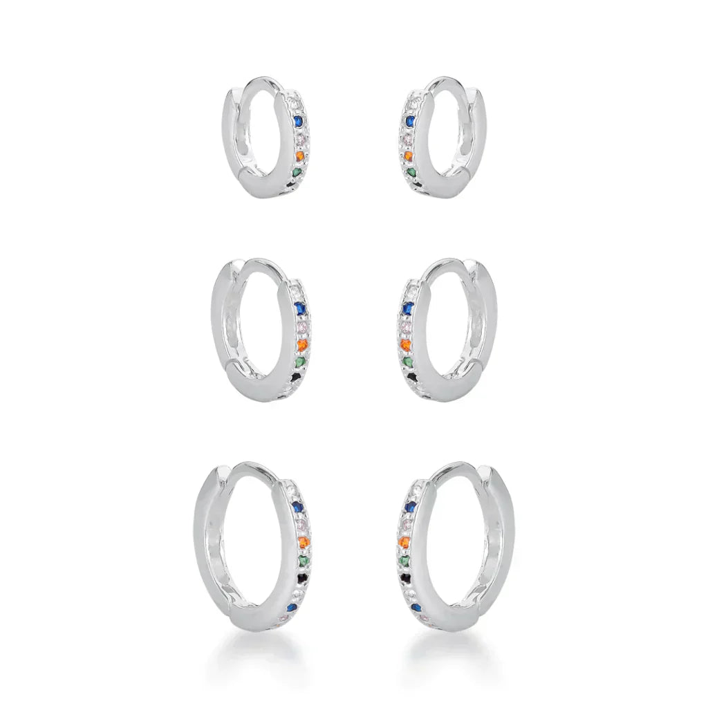 Trio de Brinco Argola Cravejado Colorido de Prata 925, vem com 3 peças lindas, com acabamento perfeito e com 1,95mm de espessura, o modelo tamanho P apresenta 11 milímetros, o modelo M apresenta 13 milímetros e o modelo tamanho G apresenta 15 milímetros, vem com o fecho de encaixe, além de ser feito com um material de excelente qualidade e durabilidade.