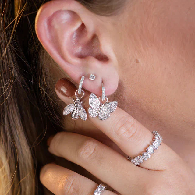 Brinco borboleta. Prata 925 com banho de ródio. Micro cravejado com zircônias. Pingente pode ser removido da argolinha, delicadeza e suavidade para sua orelha.