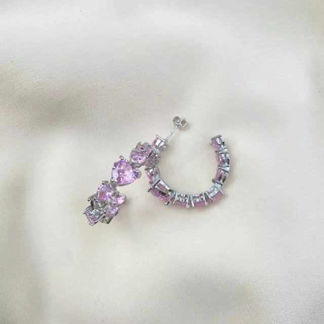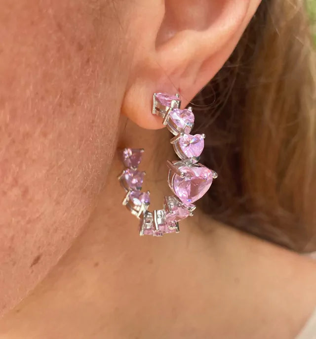 Brinco de argola cravejado com zircônia rosa em forma de coração de varios tamanhos e com banho de ródio.
