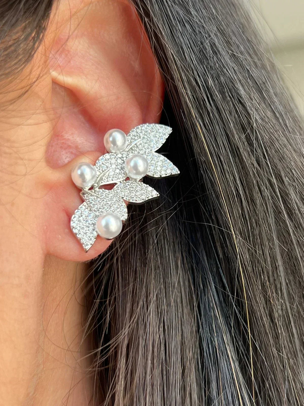 Brinco Ear Cuff com Zircônia e Pérola em prata 925 Banho de Ródio Branco