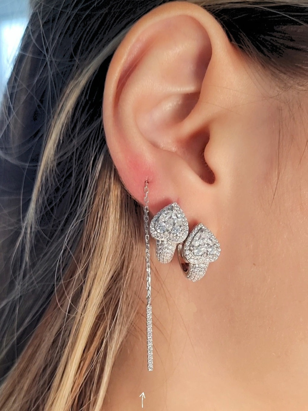 Brinco fio cravejado com zircônias, corrente em elos portugueses, confeccionado em Prata 925 com banho de ródio.