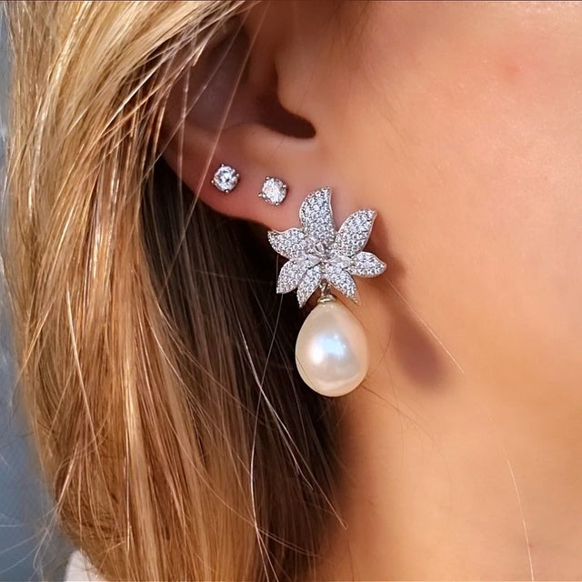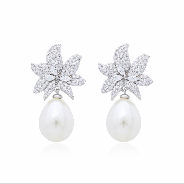 Essa peça é um clássico da joalheria mundial com toques de exclusividade que você só encontra na fabricação própria. Brinco em Prata 925 com banho de ródio, flor cravejada com micro zircônias. Pérola shell.