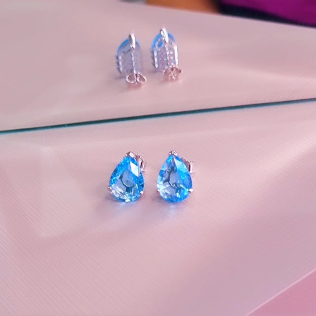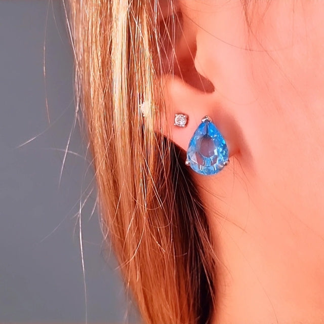 Essa peça é um clássico da joalheria mundial com toques de exclusividade que você só encontra na fabricação própria. Brinco em Prata 925 com banho de ródio em lapidação gota. Zircônias Água Marinha.