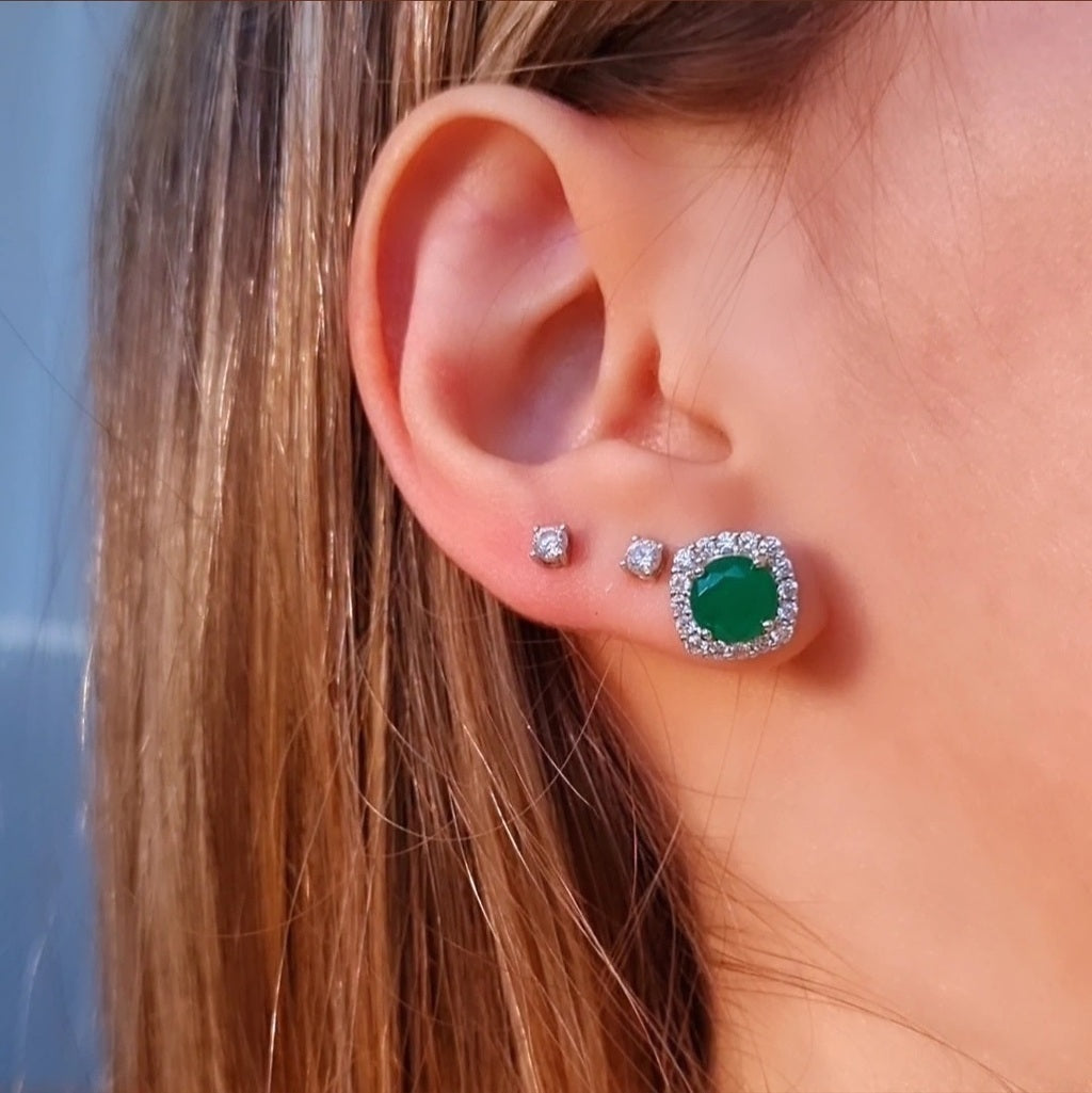 Brinco em Prata 925 com banho de ródio, com zircônia central na cor esmeralda (0,7 mm) e moldura em zircônias brancas.