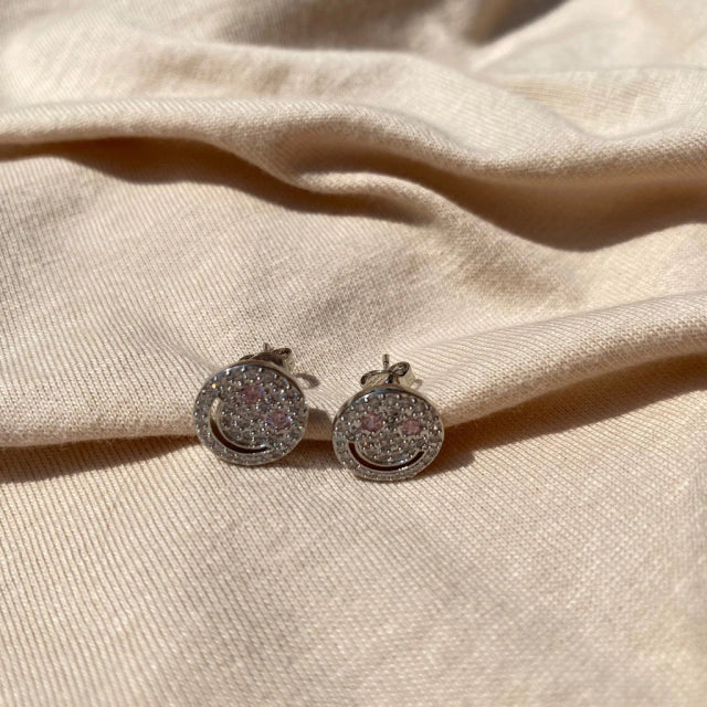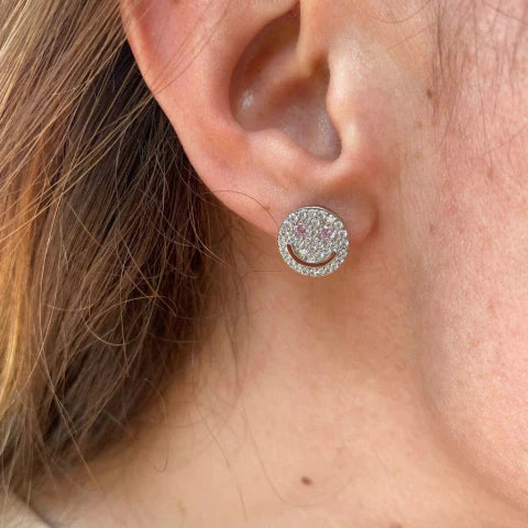 Brinco smile cravejado com zircônia branca e rosa e com banho de ródio.