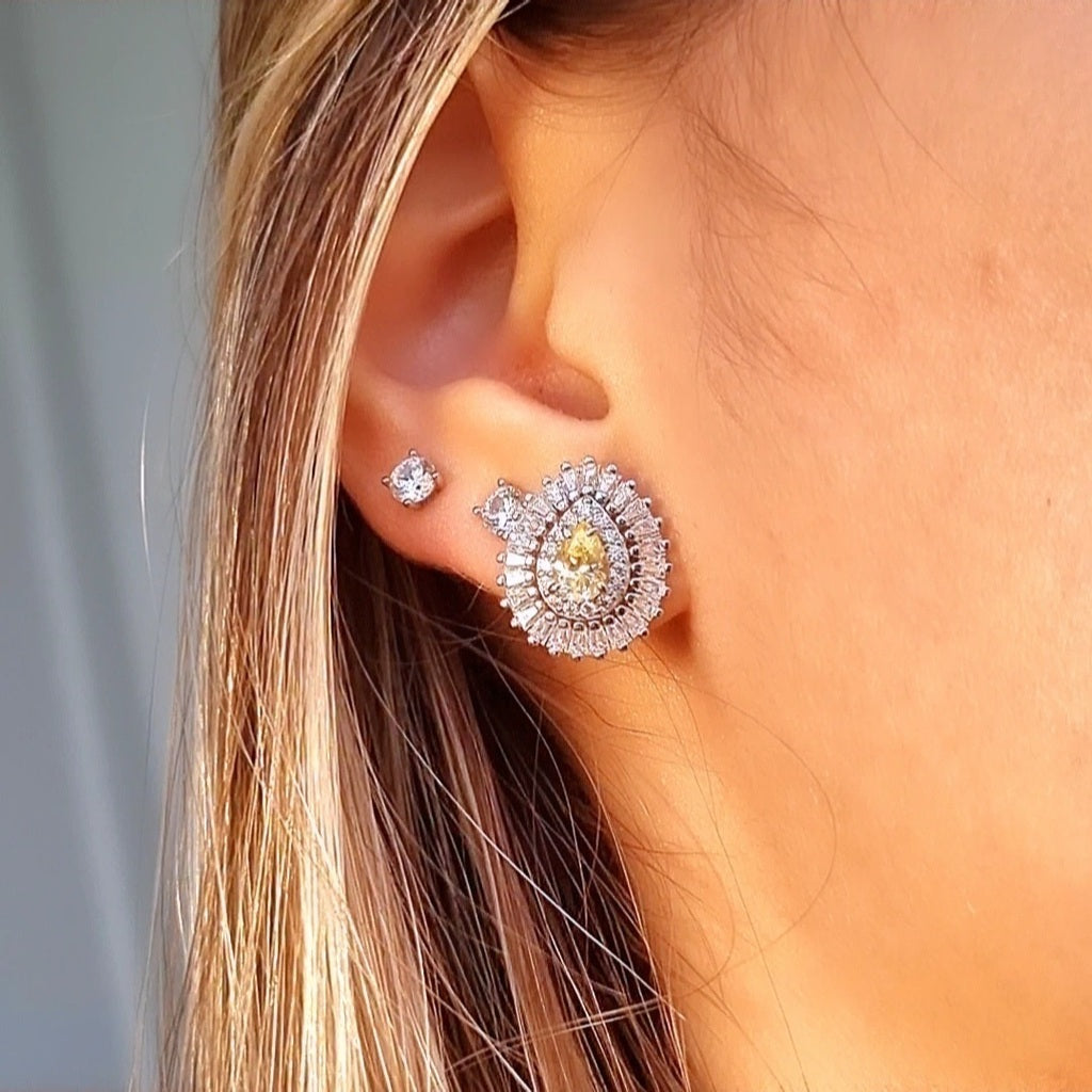 Essa peça é um clássico da joalheria mundial com toques de exclusividade que você só encontra na fabricação própria. Brinco em Prata 925 com banho de ródio em lapidação gota com moldura em micro zircônias e baguetes. Pedra central Yellow Fance.
