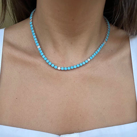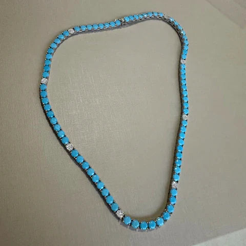 Riviera com pedra natural turquesa, de 5mm, com pontos de zircônia branca. Comprimento de 42cm.
