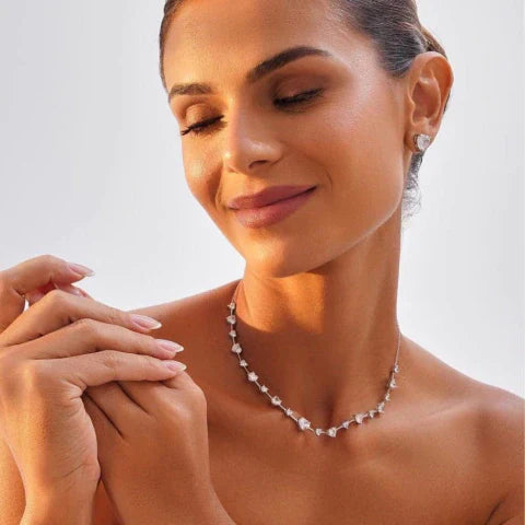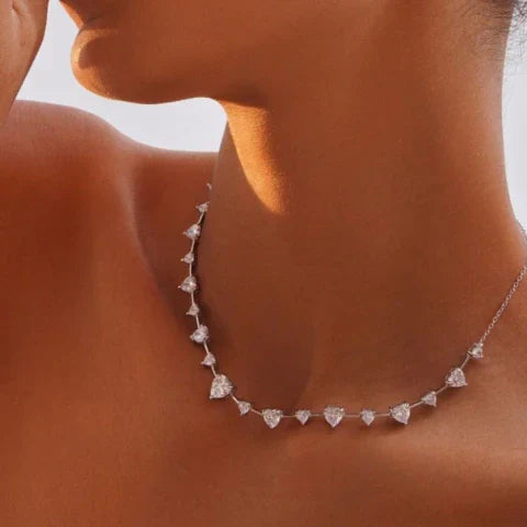 Colar Riviera Fio Faca Prata 925, com corações de 6mm na pedra zircônia intercalados com corações na zircônia de 4mm. Sendo do coração central de 8mm. Comprimento de 40cm + extensor de 5cm.