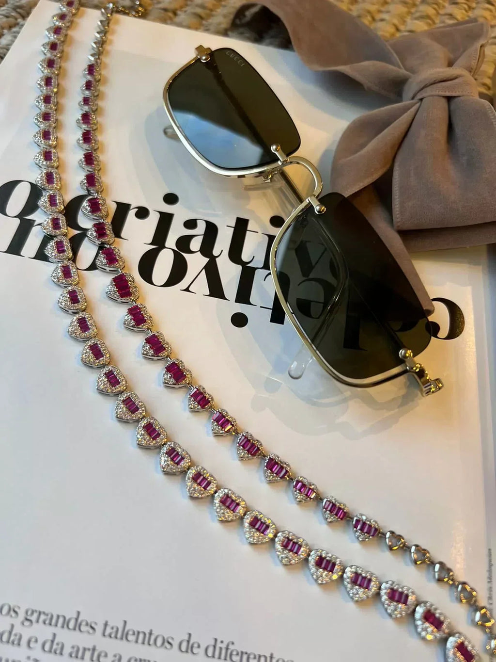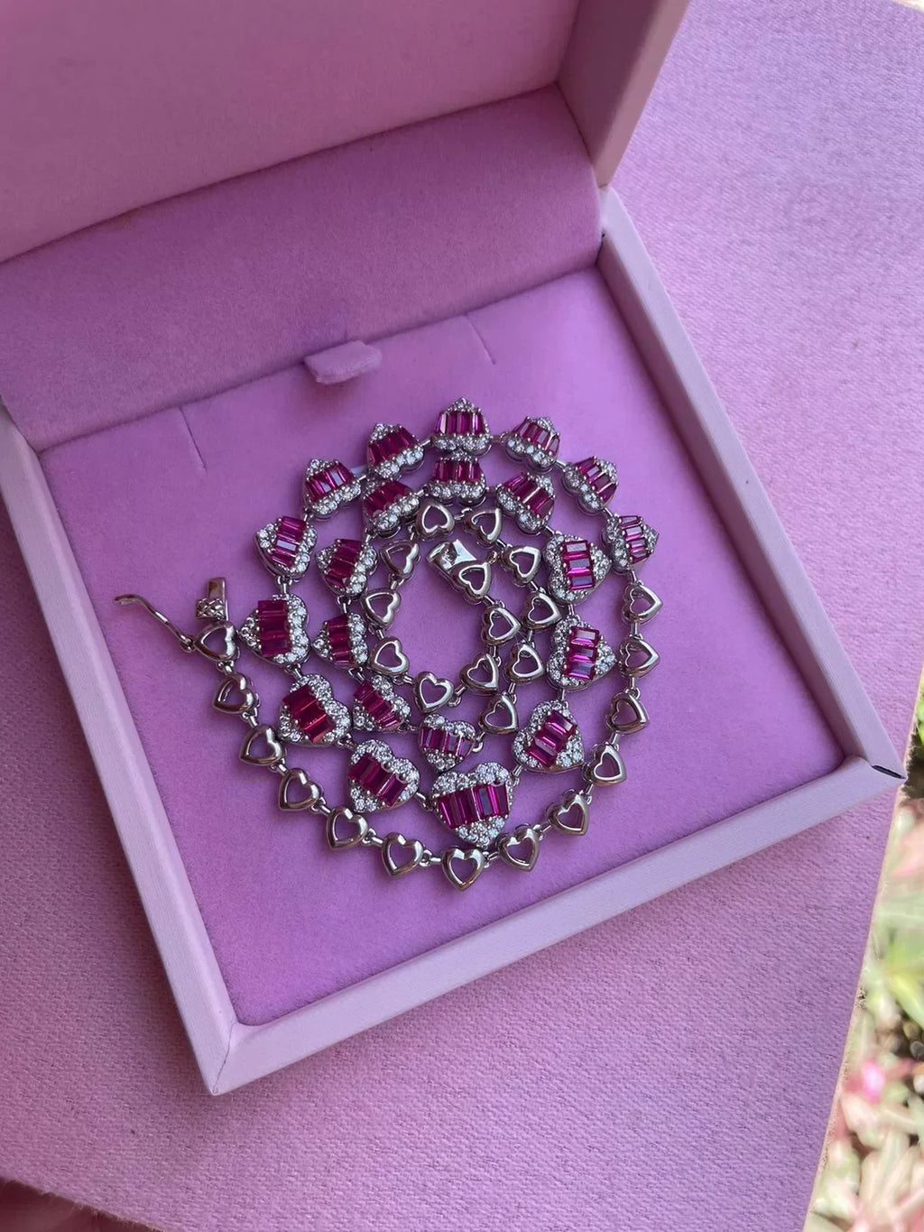 Riviera com Coração Cristal e Pink e Coração Liso (Fecho Joia) em Prata 925 de Ródio Branco