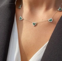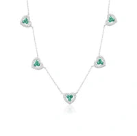 Colar modelo gargantilha confeccionado em Prata 925 com banho de ródio, corrente modelo elo português com 5 pingentes fixos na corrente design corações cravejados com detalhe central em três zircônias e moldura de cravação em zircônias incolores.