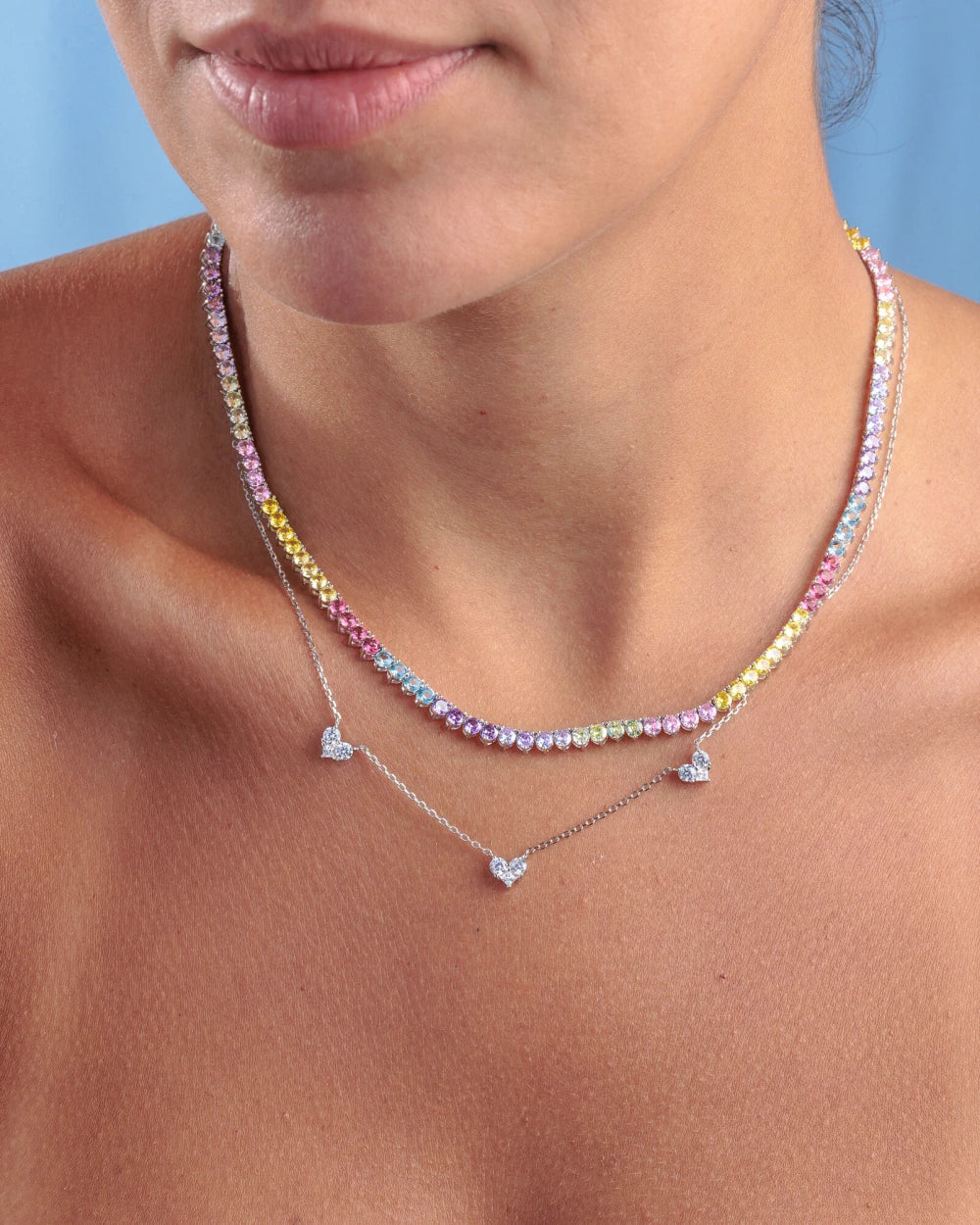 Colar delicado em prata 925 com banho de ródio branco, corrente de elos intercalados com três corações, na cravação de zircônias cristais.