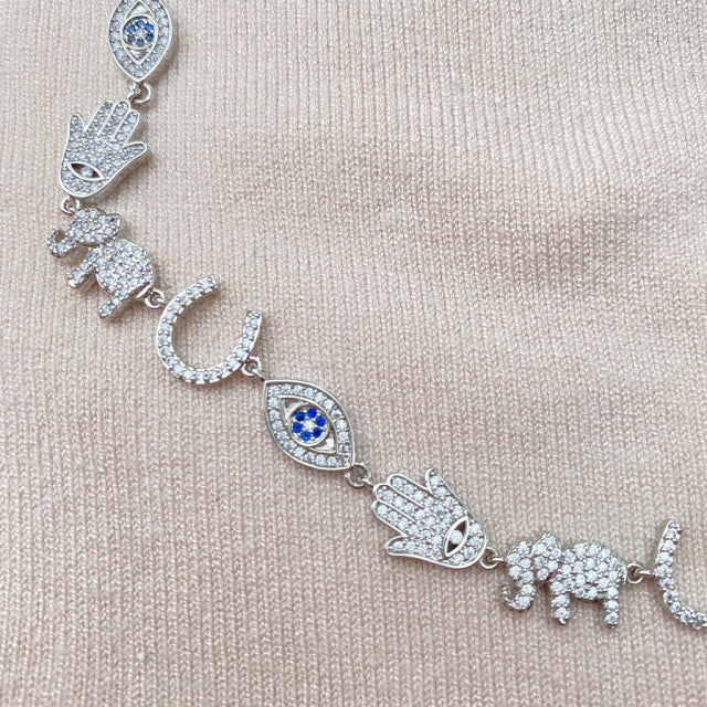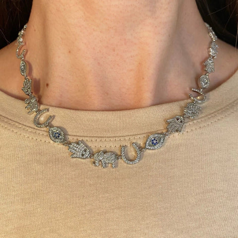 Colar com símbolos de proteção, cravejados com zircônia em Prata 925 e com banho de ródio.