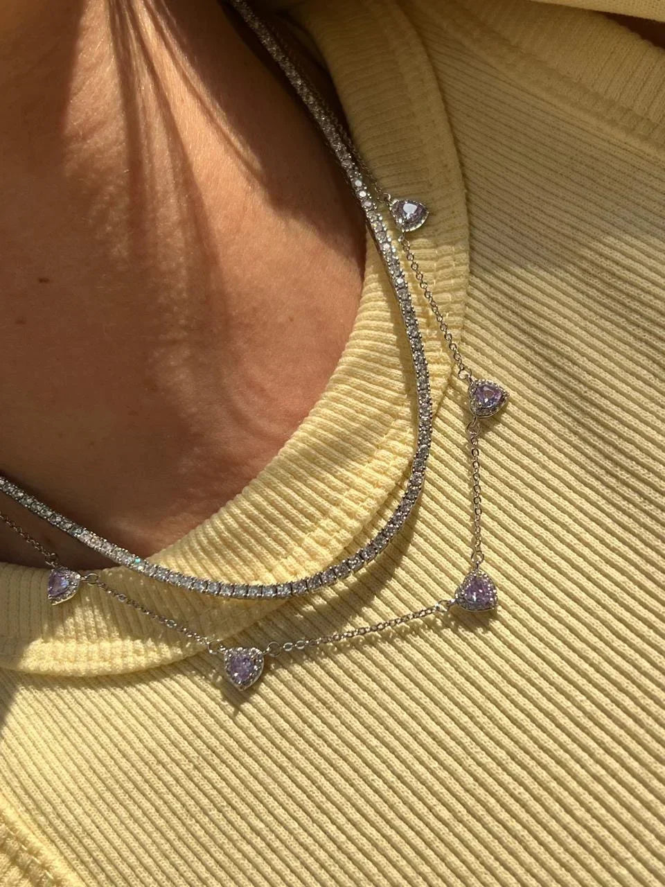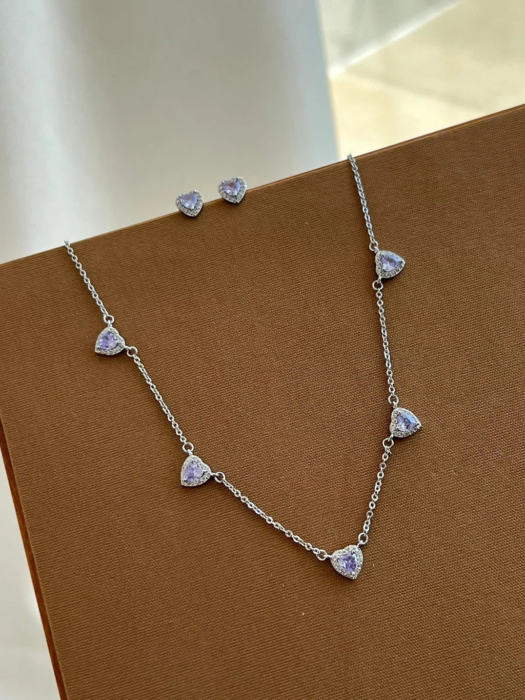 Conjunto com Mini Corações Lilás e Cristal em Prata 925 Banho de Ródio Branco