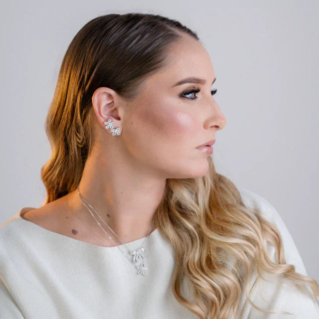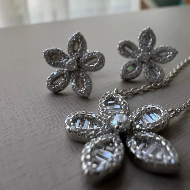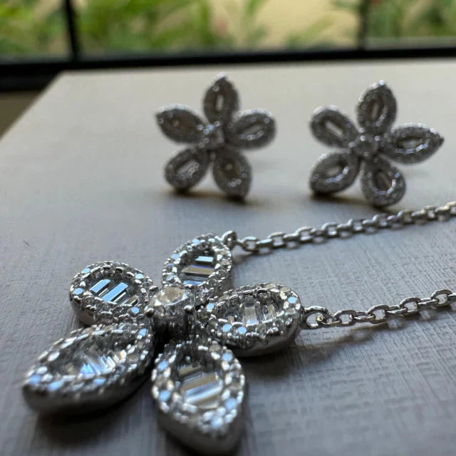 Conjunto flor, brinco e colar. Prata 925 com banho de ródio branco. Uma peça pra acrescentar delicadeza e elegância as suas composições, ideal para ser usada tanto dia como noite.