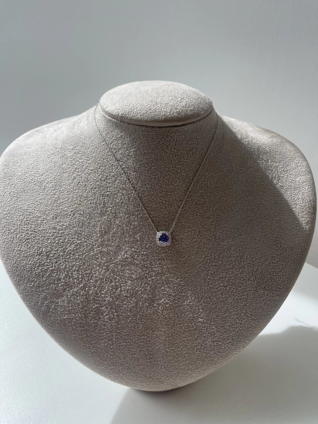 Conjunto com formato quadrado, cravejado com zircônias, na Tanzanita. Corrente: 40cm + 10cm de Extensor. Prata 925.