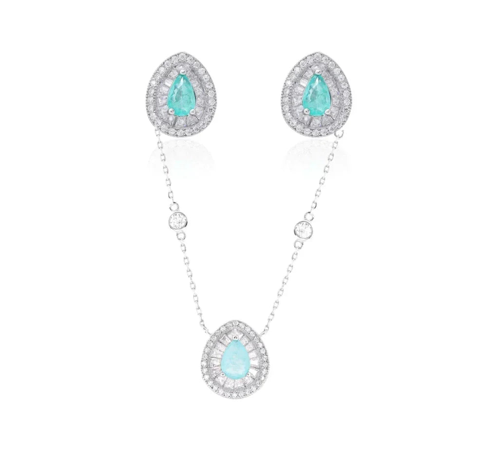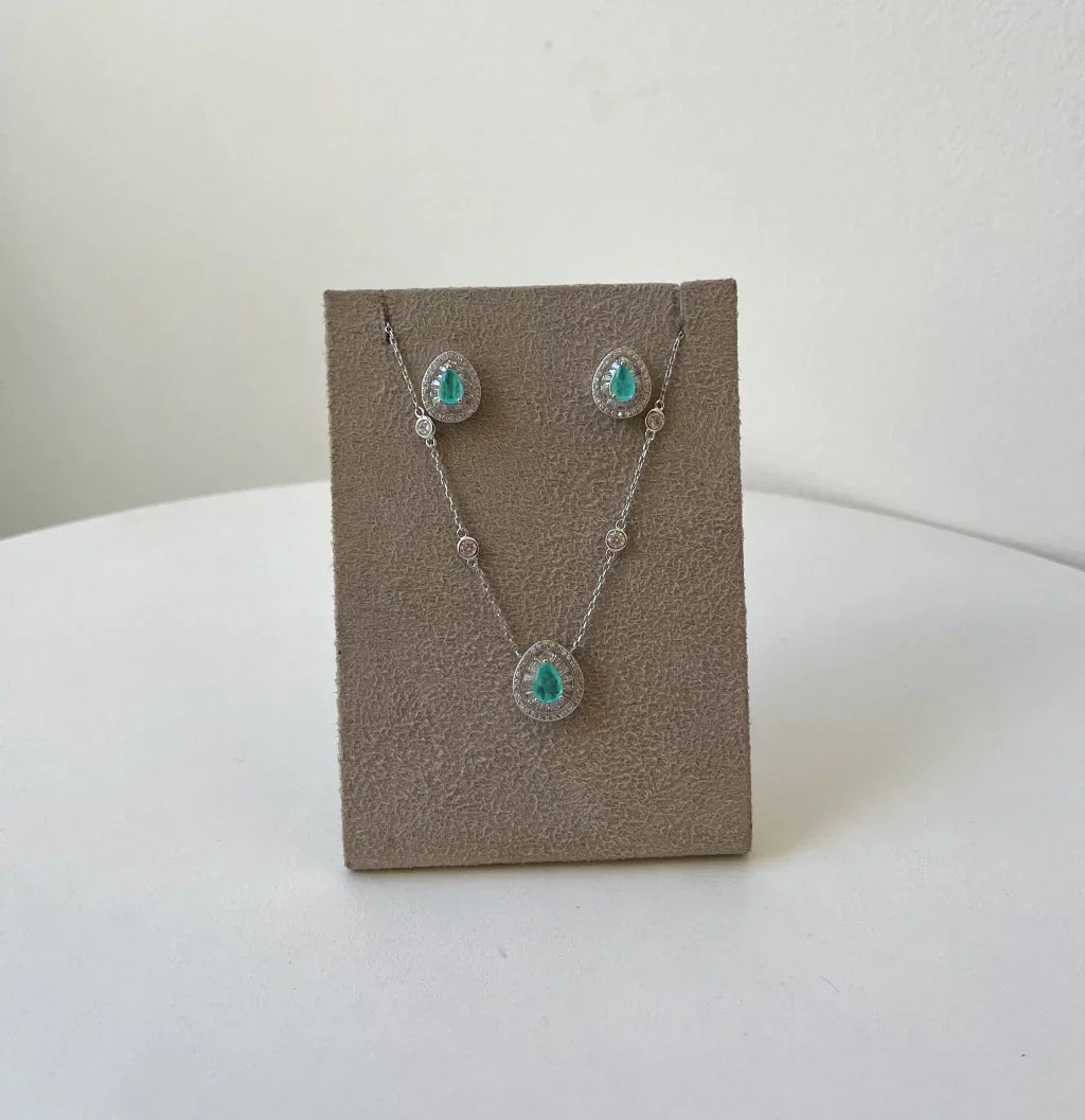 Conjunto gota baguete, com cravação de micro zircônias. Pedra central: Esmeralda Colombiana Corrente: 40cm + 5 cm de Extensor. Prata 925.