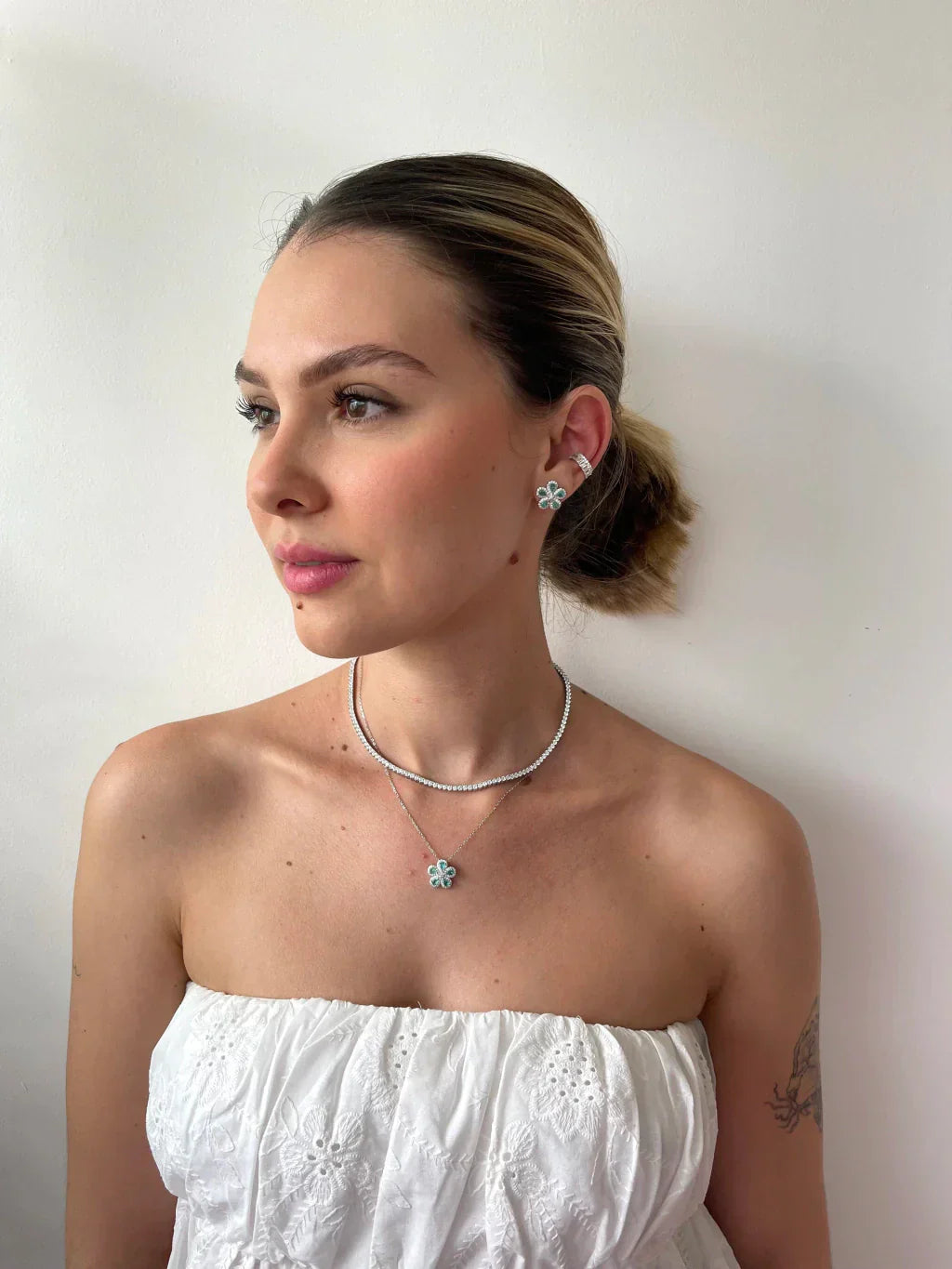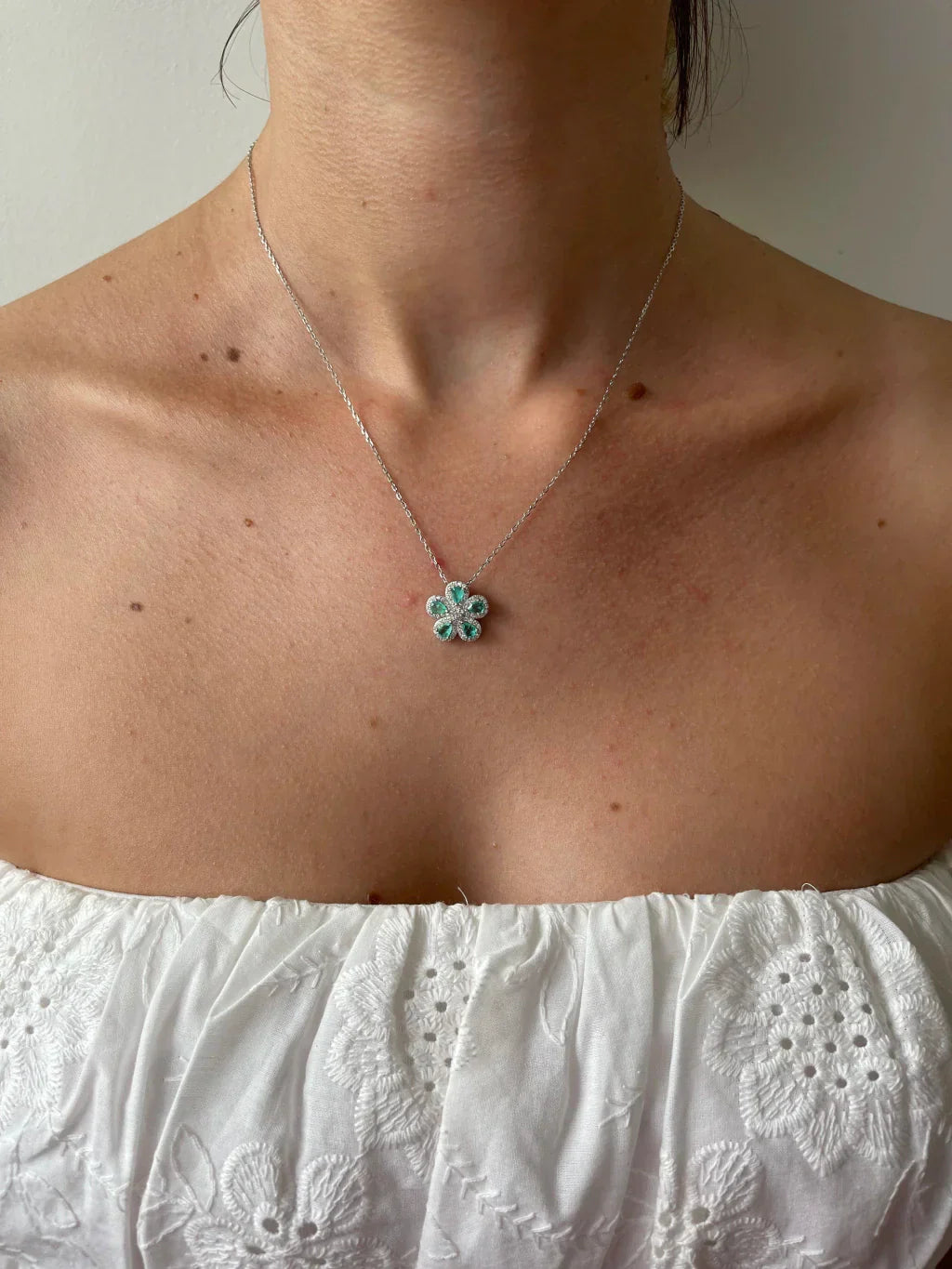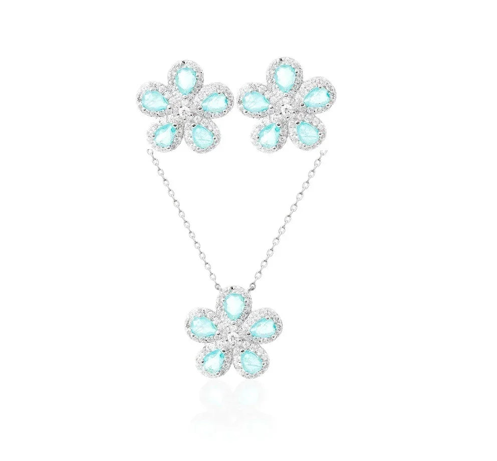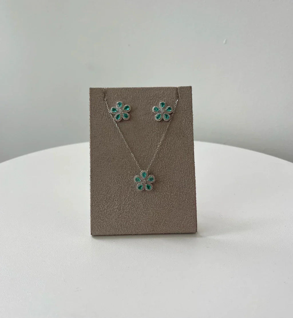 Conjunto mandala, cravejado em micro zircônias. Cor: Esmeralda Colombiana; Corrente: 40cm + 5cm de extensor; Joias em prata 925.