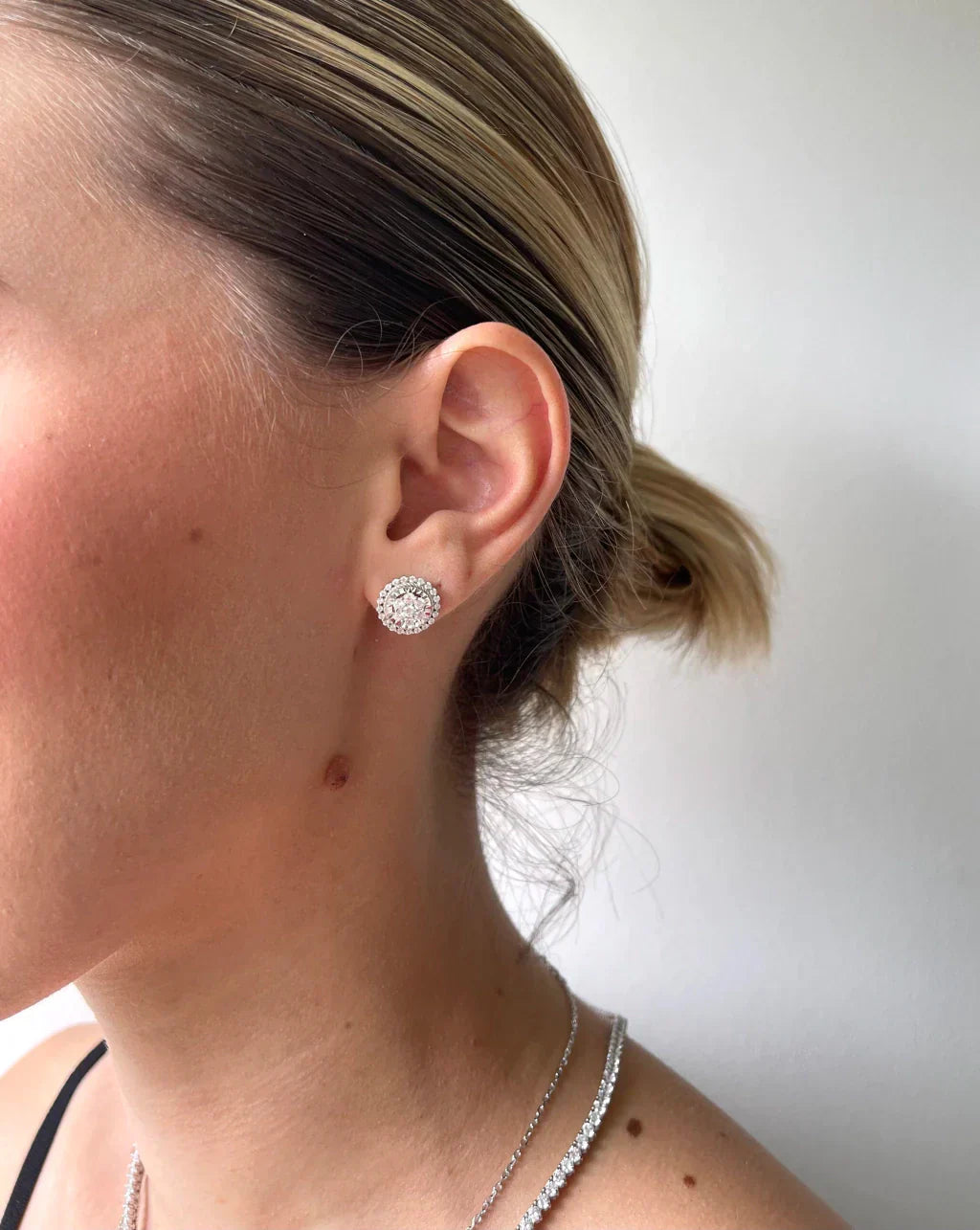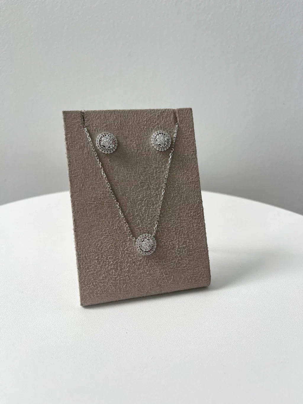 Conjunto ponto de luz, com cravação central de flor, em micro zircônias. Corrente: 40cm + 5cm de extensor; Joias em prata 925.