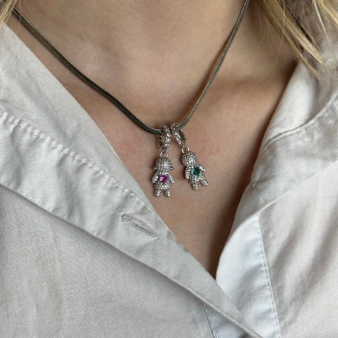 Pingente Girl cravejado com pedra central, banhado em Ródio Branco.