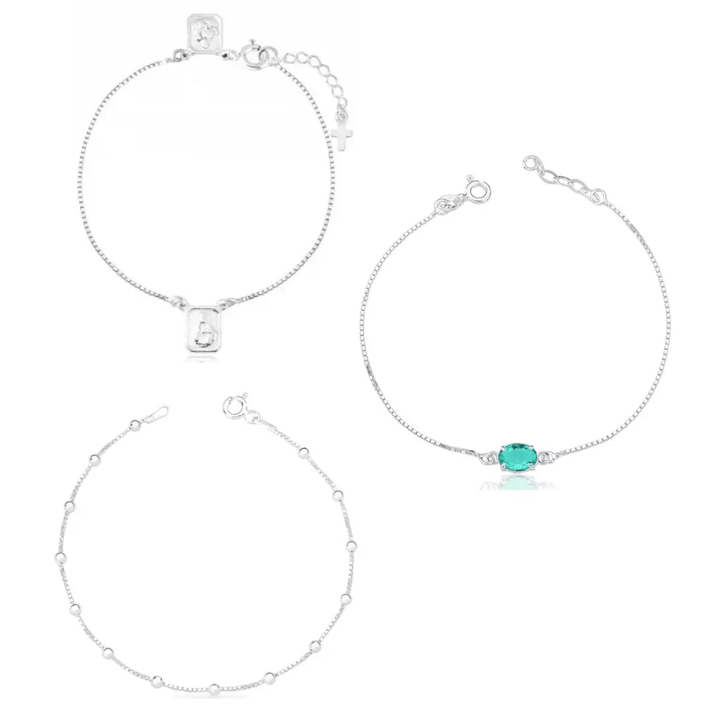 Esse kit de pulseiras une sofisticação e versatilidade. A Pulseira Bolinhas Veneziana, em Prata 925, apresenta uma corrente fina e bolinhas delicadas, perfeita para qualquer ocasião. A Pulseira Escapulário Veneziana, com seu estilo clássico e pingentes em formato de medalhas, traz um toque de significado e é ideal para presentear. Por fim, a Pulseira Turmalina Paraíba, com sua cor estilosa, evoca serenidade e criatividade, complementando qualquer look. Juntas, essas joias são uma combinação de elegância e durabilidade.