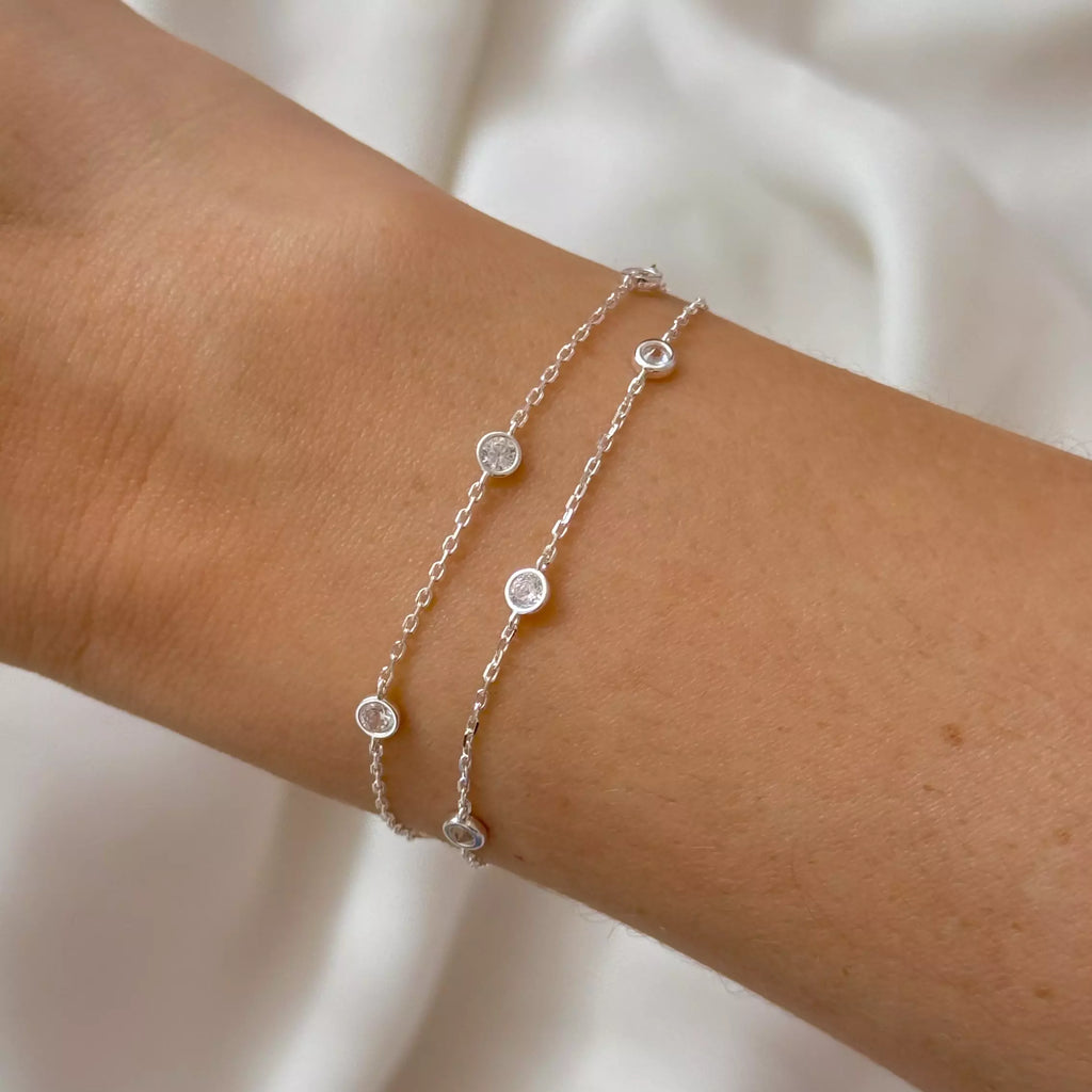 A Pulseira Ponto de Luz Dupla de Prata traz um charme delicado e elegante em cada detalhe. Com duas zircônias que captam a luz com intensidade, ela é ideal para complementar seu visual com sofisticação e leveza.
