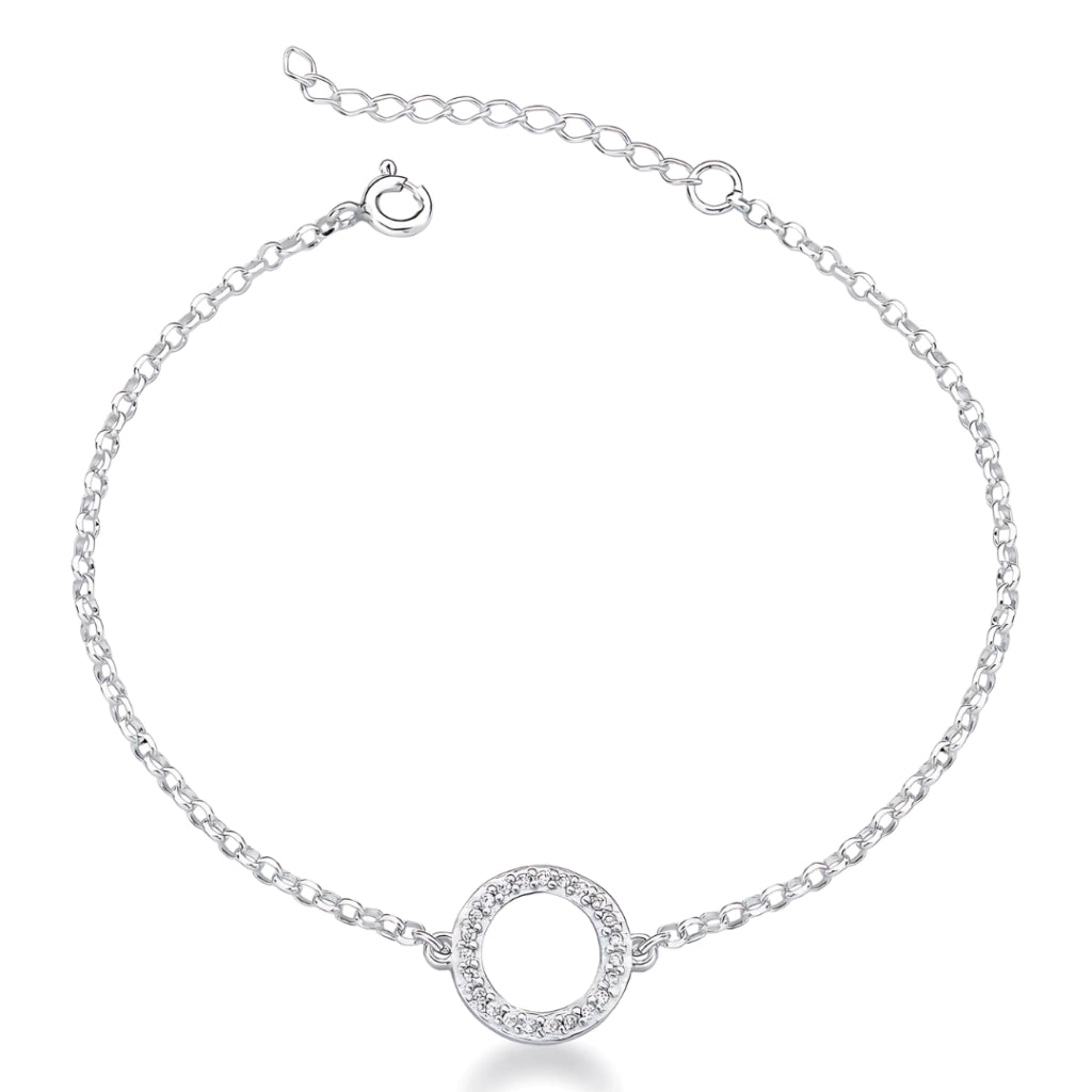 Uma Pulseira Redondo Cravejado confeccionada em prata 925 e zircônia, e o certificado de autenticidade.