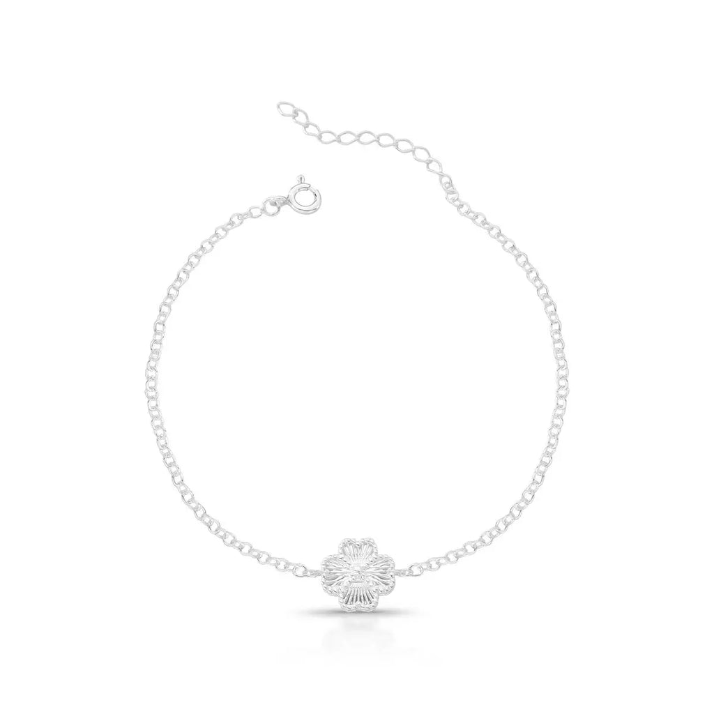 Uma Pulseira Trevo da Sorte de Prata confeccionada em prata 925, e o certificado de autenticidade.
