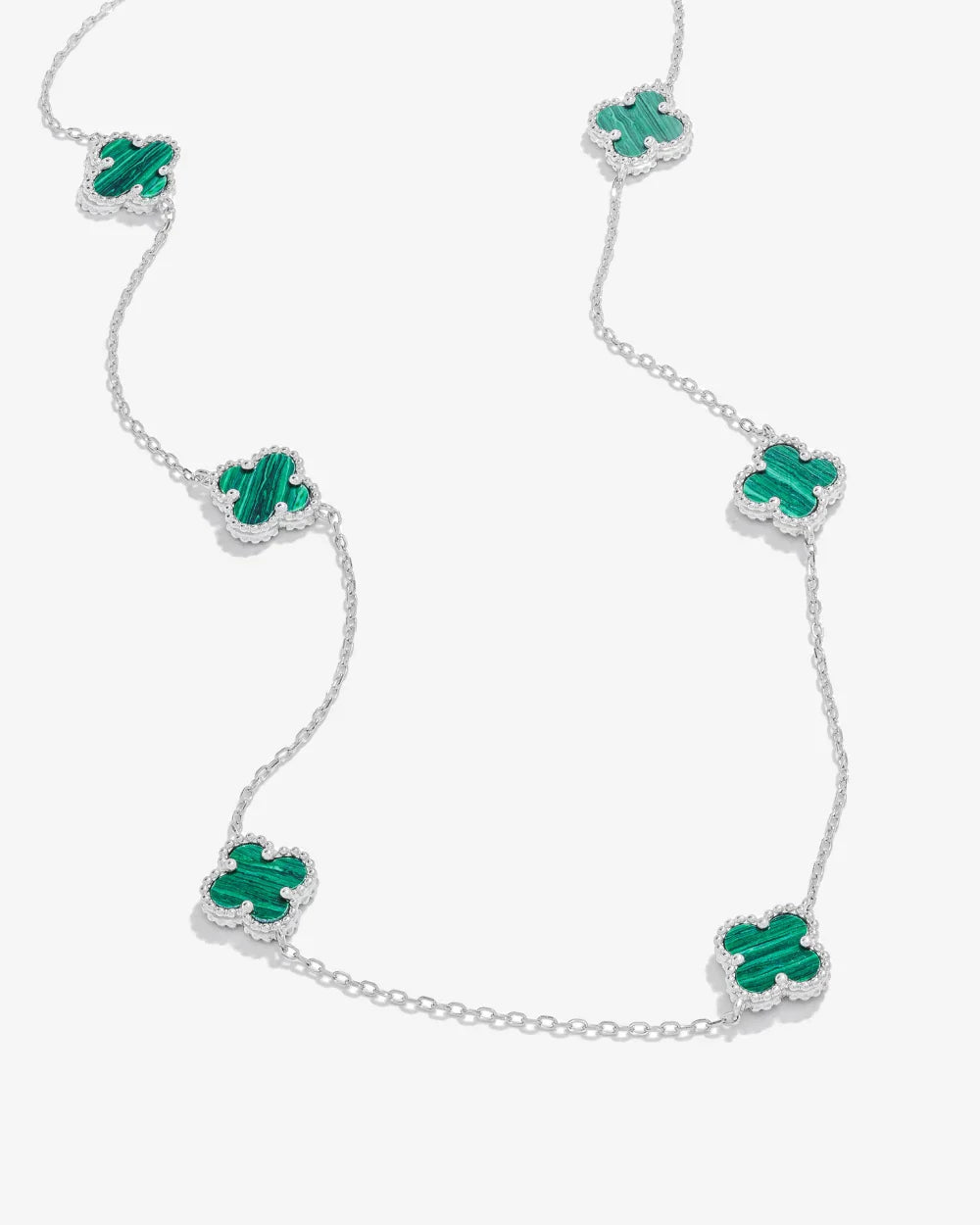 Confeccionado em Prata 925 e banho de Ródio Branco, com corrente delicada de elos Cartier e seis pequenos trevos trabalhados em pedra Malaquita com contornos de micro esferinhas.