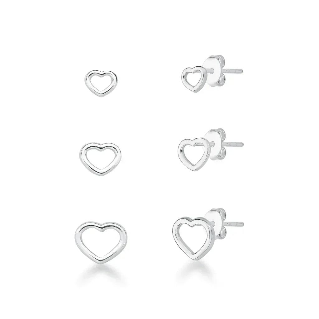 Trio de Brinco Coração Vazado Liso de Prata 925, vem com 3 peças lindas, com acabamento perfeito e com 1,45mm de espessura, o modelo tamanho P apresenta 6,5 milímetros, o modelo M apresenta 8 milímetros e o modelo tamanho G apresenta 9,75 milímetros, vem com o fecho de tarracha, além de ser feito com um material de excelente qualidade e durabilidade.