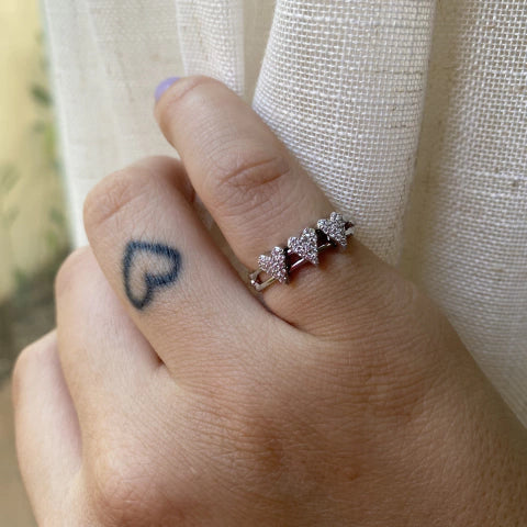 Anel 3 corações, prata 925 com banho de ródio branco. Corações com movimento, cravejados com zircônias naturais.