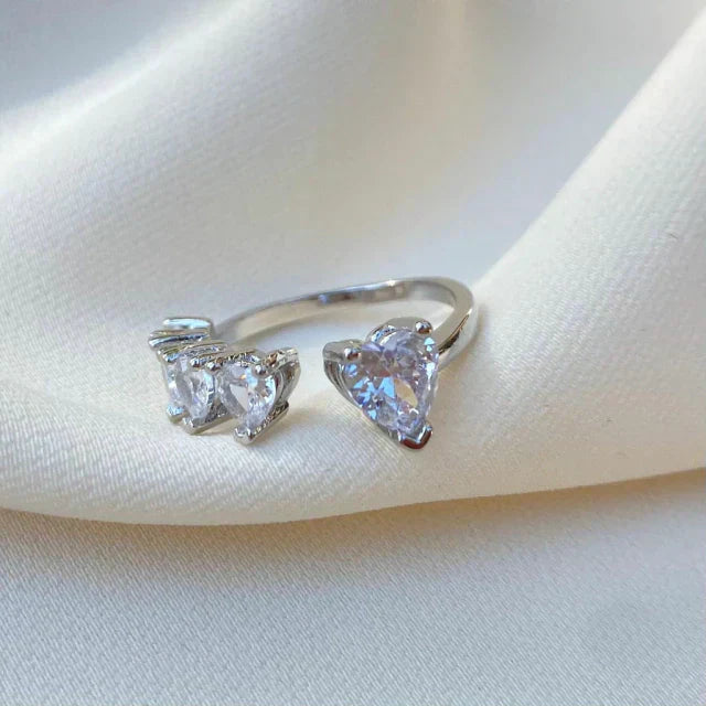 Anel em metal cravejado com zircônia em forma de coração.