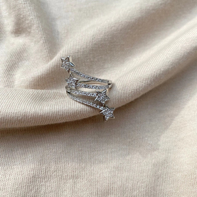 Anel estrela cadente cravejado com zircônias.