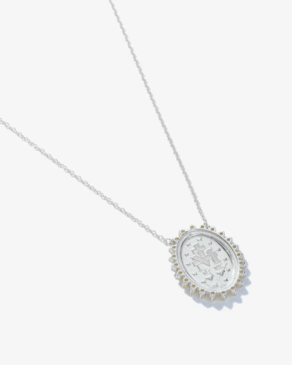 Colar modelo religioso, em prata 925 em banho de Ródio Branco e Ouro 18k, corrente fininha de elos Cartier, com Pingente do Sagrado Coração de Jesus, com detalhes de Micro Cravações de Zircônias Cristais na Cruz e no Coração.